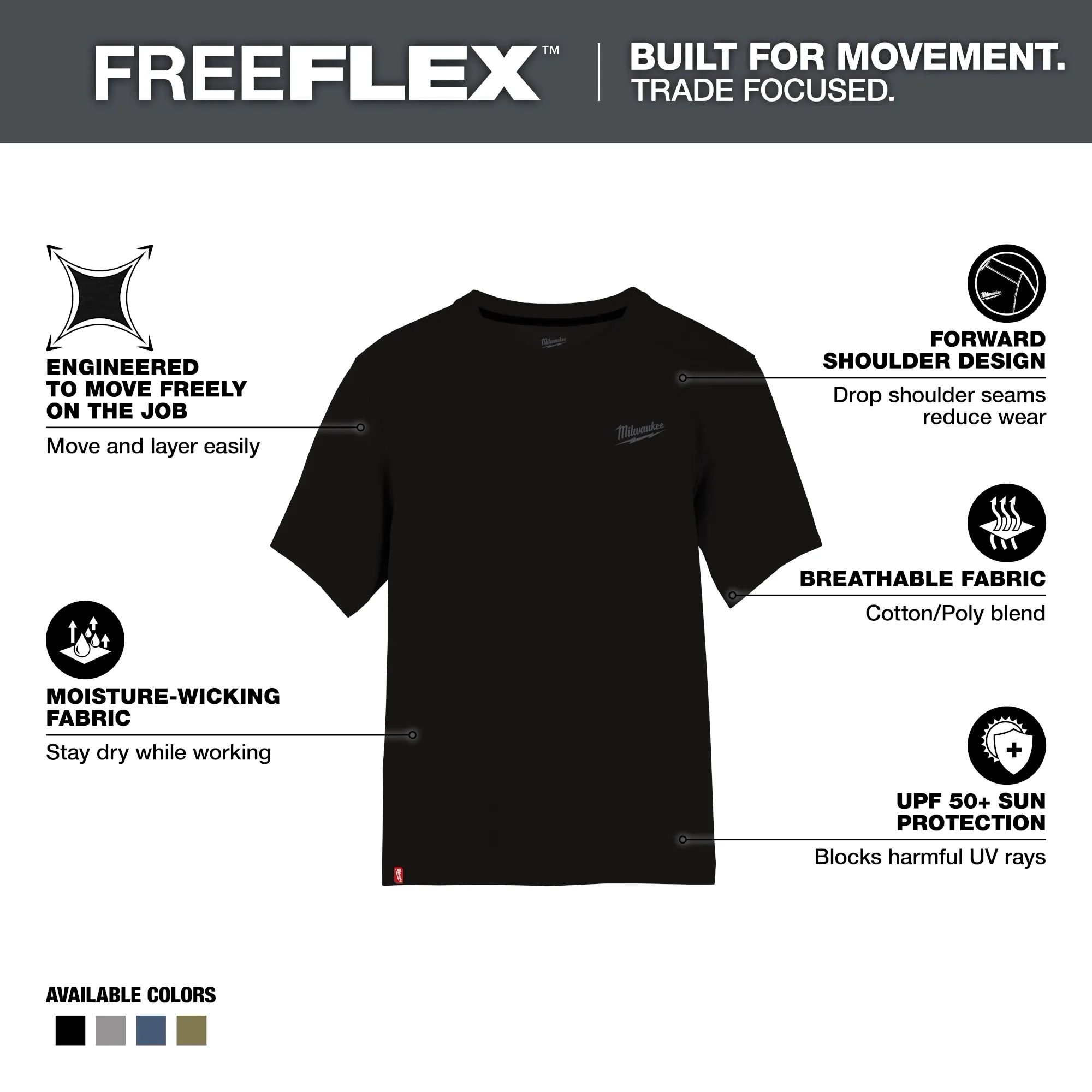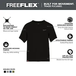 Part of the MILWAUKEE® FREEFLEX™ Collection, our Short Sleeve Hybrid Work Tee is BUILT FOR MOVEMENT. Our Short Sleeve Hybrid Work Tee is a lightweight and breathable solution that allows you to STAY COMFORTABLE and KEEP COOL. This work t-shirt is specifically created for mobility and durability with its drop shoulder design to reduce wear on the seams. The MILWAUKEE® Hybrid Work Tee Shirts are built to protect against the elements, offering UPF 50 protection for those warm days on the jobsite and moisture-wicking fabric so you can stay dry while working. Choose from a variety of colors, including black, blue, gray, and green, available in sizes small to 3XL.