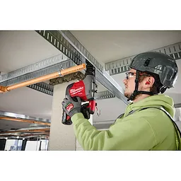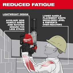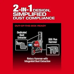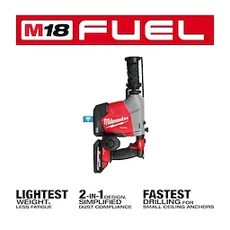 The M18 FUEL™ Overhead Rotary Hammer w/ Integrated Dust Extraction is a new-to-world solution optimized for ceiling drilling. This 2-in-1 design delivers improved ergonomics for overhead work compared to traditional rotary hammer and dust extractor attachments, while maintaining Table 1 compliance. This SDS Plus rotary hammer provides several new features that keep operators productive and comfortable for repetitive drilling overhead. The built-in dust extractor creates a compact, lightweight tool with optimized balance for less fatigue. The newly designed side handle, now located near the rear handle, allows the operator to maintain better body posture throughout the application. The handle can be inserted on the left or right of the tool and can be collapsed for easy storage. AUTOSTOP™ Kickback control offers enhanced safety for the operator by preventing over-rotation in a bind-up. With ONE-KEY™, users can choose between default and low sensitivity settings for AUTOSTOP™ feature, in addition to tool tracking and management. The M18 FUEL™ Overhead Rotary Hammer w/ Integrated Dust Extraction provides simplified dust compliance and superior ergonomics, while still delivering best-in-class performance. The POWERSTATE™ Brushless motor provides fastest drilling for small ceiling anchors and enough power to complete up to 5/8” holes in concrete.