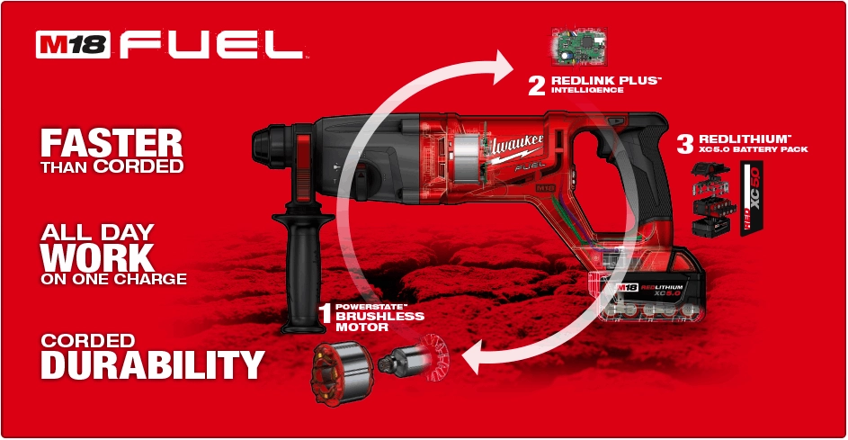 Whether its compact, medium or large drilling ranges for SDS Plus or larger drilling and chipping applications users can now accomplish them all on the same battery platform without the need of extension cords or generators. Our M18™ battery not only powers the widest range of cordless rotary hammers on the market, but it also powers 100+ other tools on the same platform.
